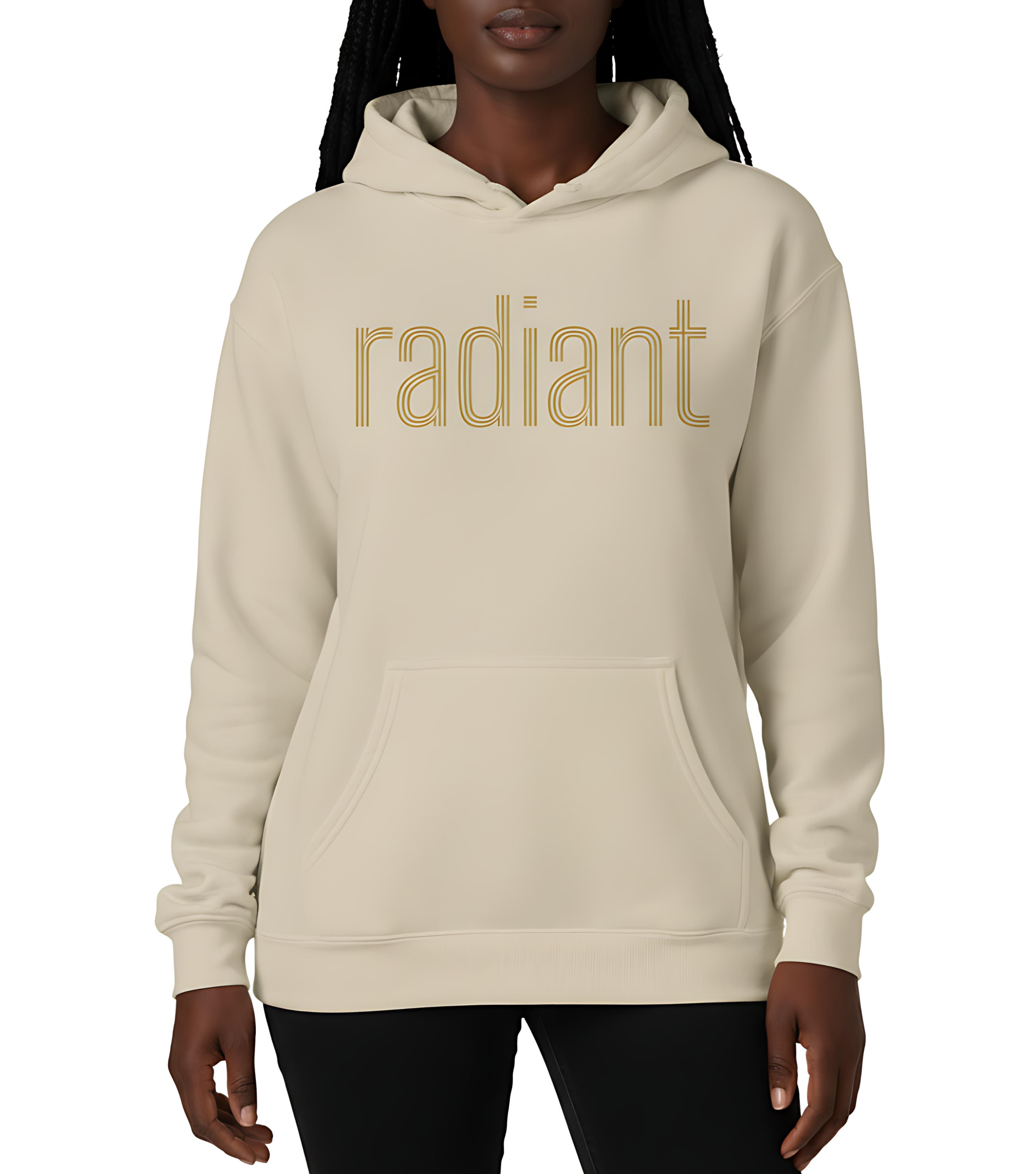 The Radiant Glow Lab Hoodie is designed with intention — calm, confident, and quietly luminous. Featuring the word radiant across the chest in a soft gold tone, this piece carries a gentle glow rather than a loud statement. The warm, neutral base and minimalist lettering create a sunlit feel, like morning light filling a familiar space.