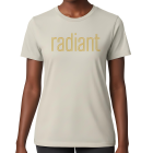 Printed in a muted gold tone on a light, natural base, this tee carries its message without forcing it. The minimalist “radiant” lettering reads as calm, grounded confidence — the kind that doesn’t need to announce itself to be felt. It’s the piece you reach for on days when you want to feel centered, put together, and gently powerful.