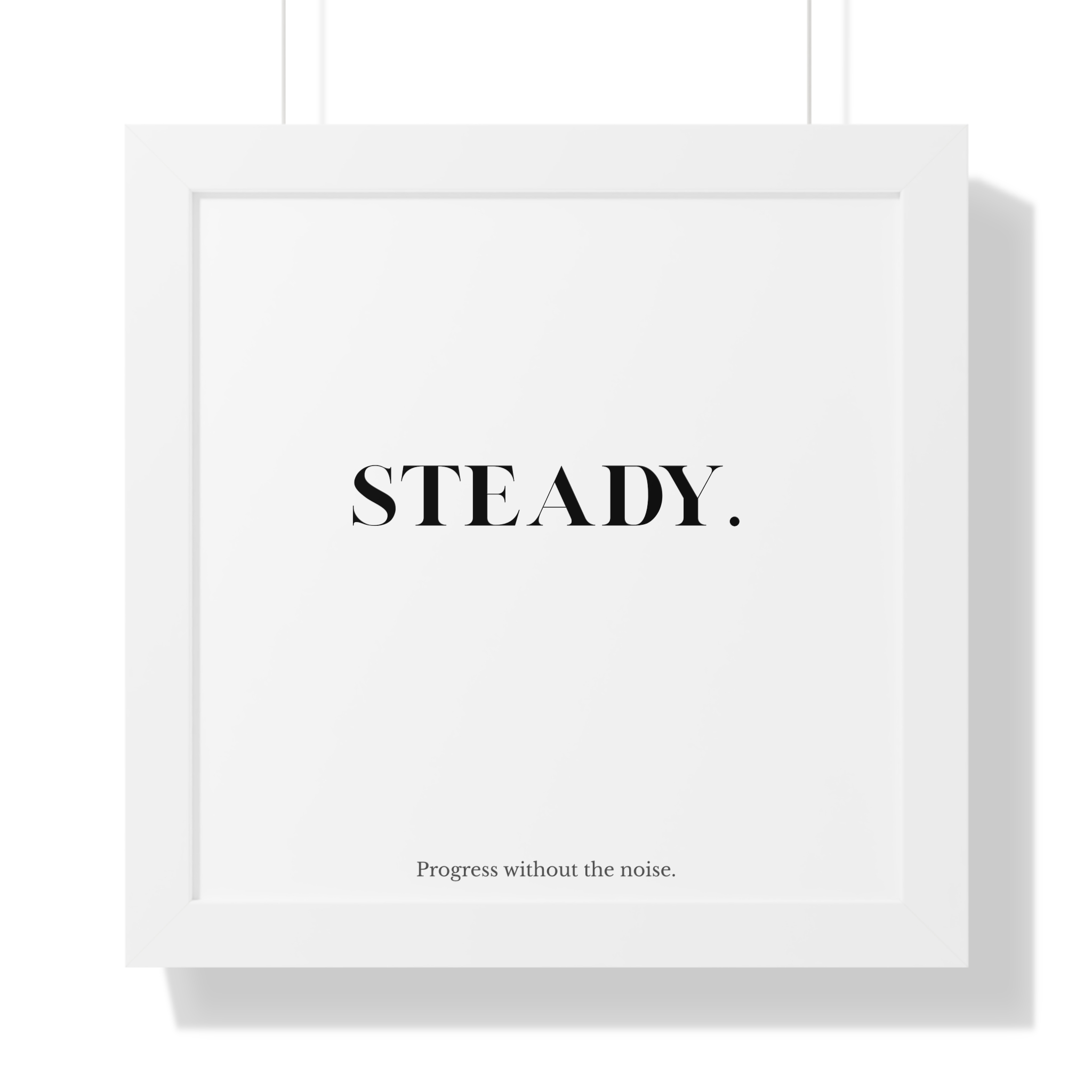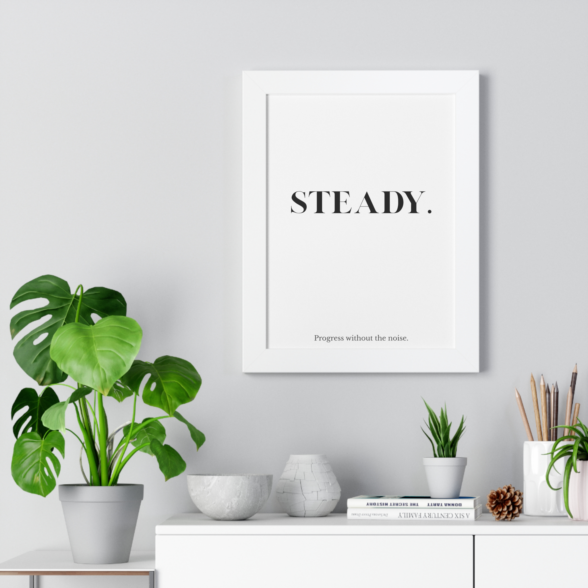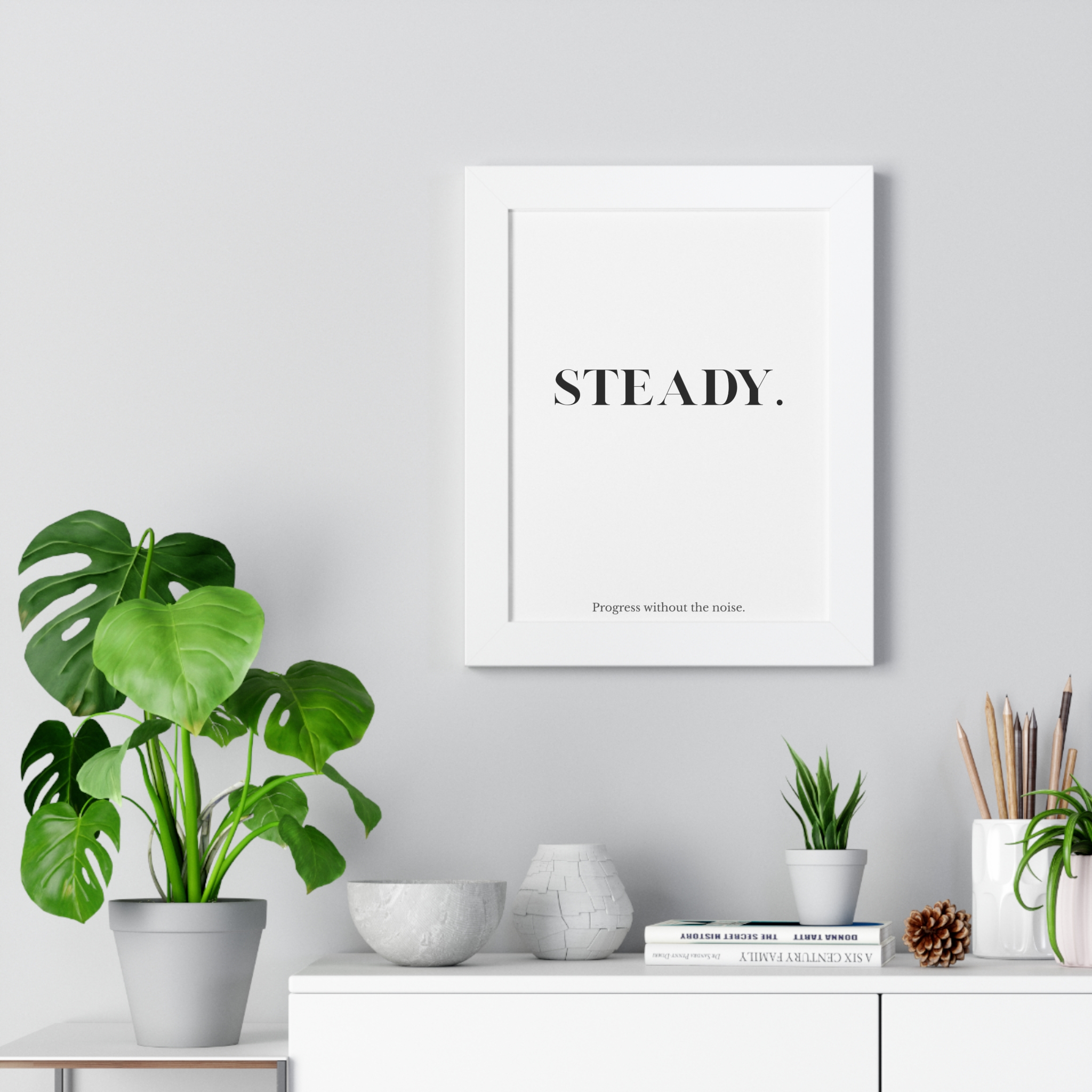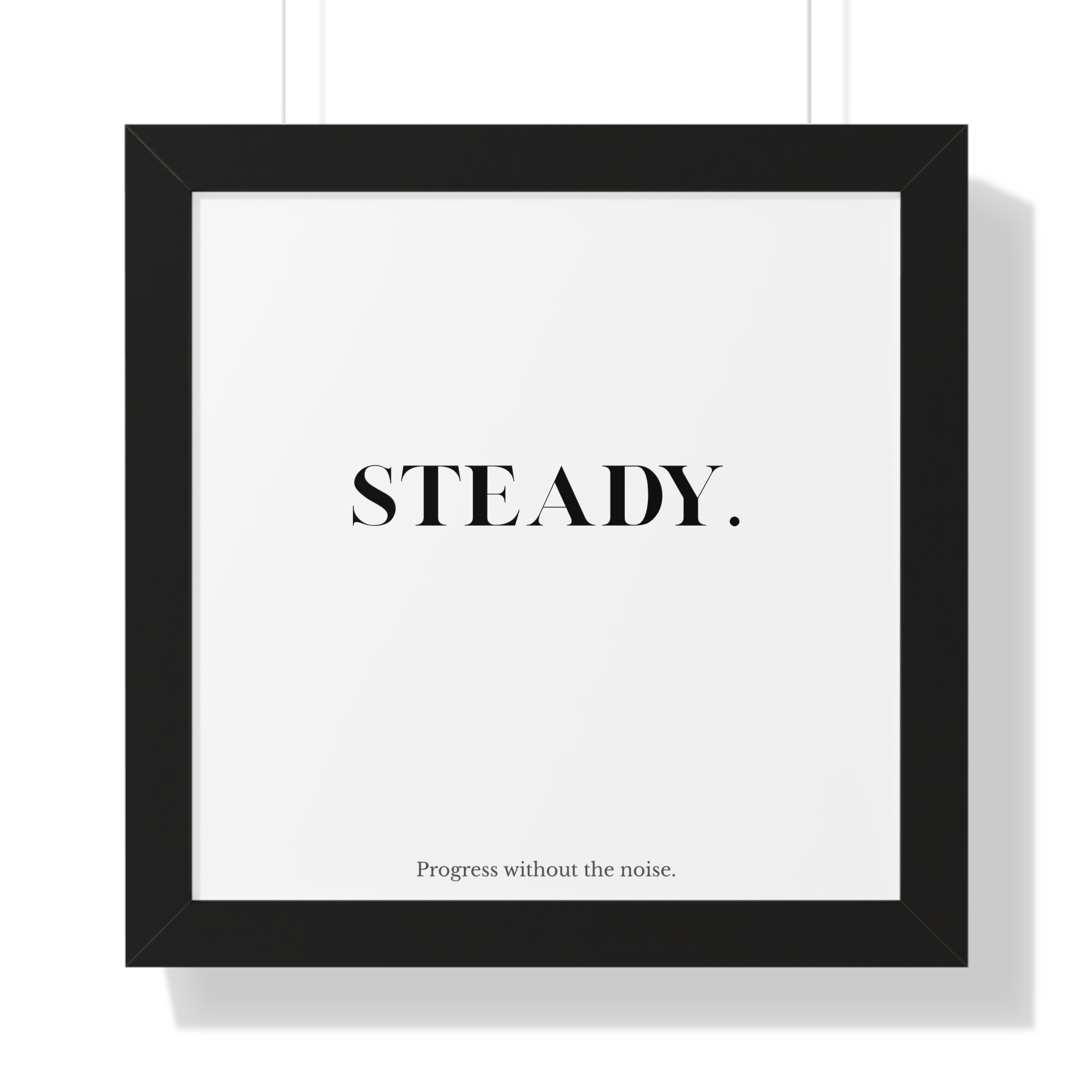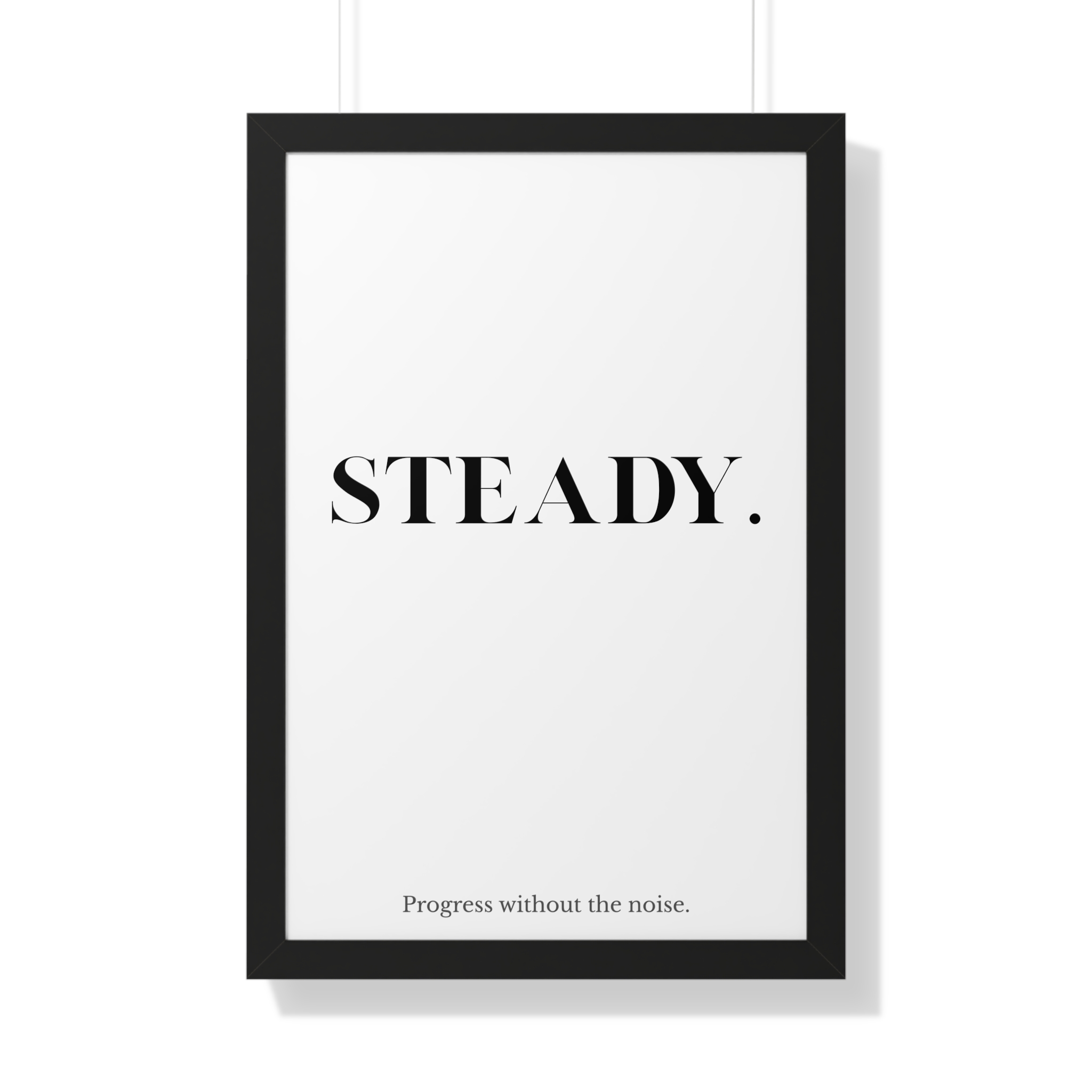 The STEADY. framed poster is a minimalist affirmation piece designed to support patience, resilience, and quiet progress. Featuring bold serif typography paired with the reassuring line “Progress without the noise,” this artwork encourages movement without pressure.