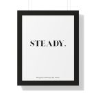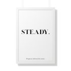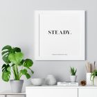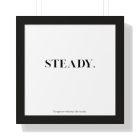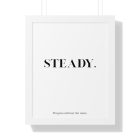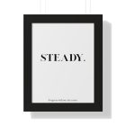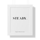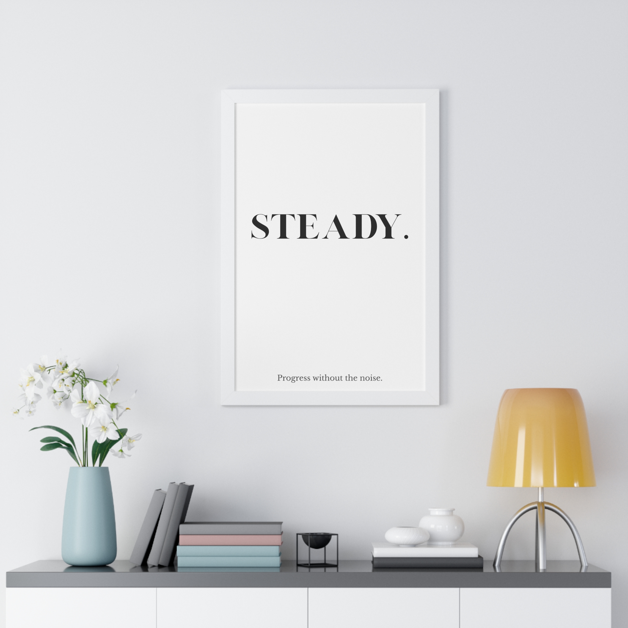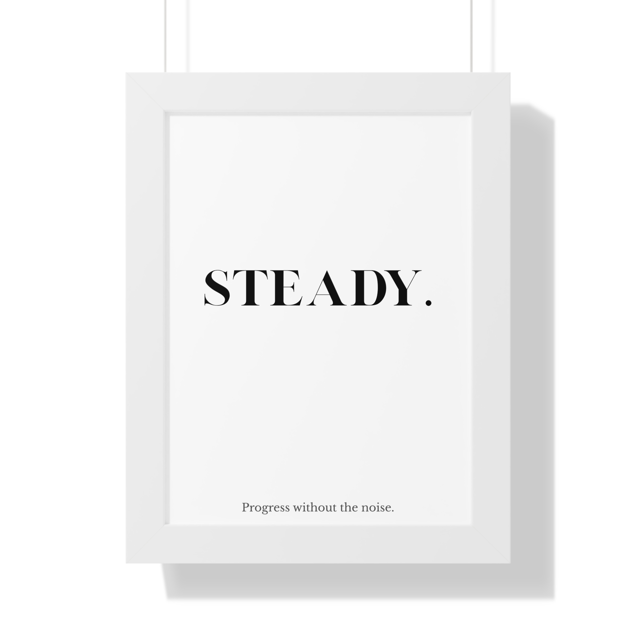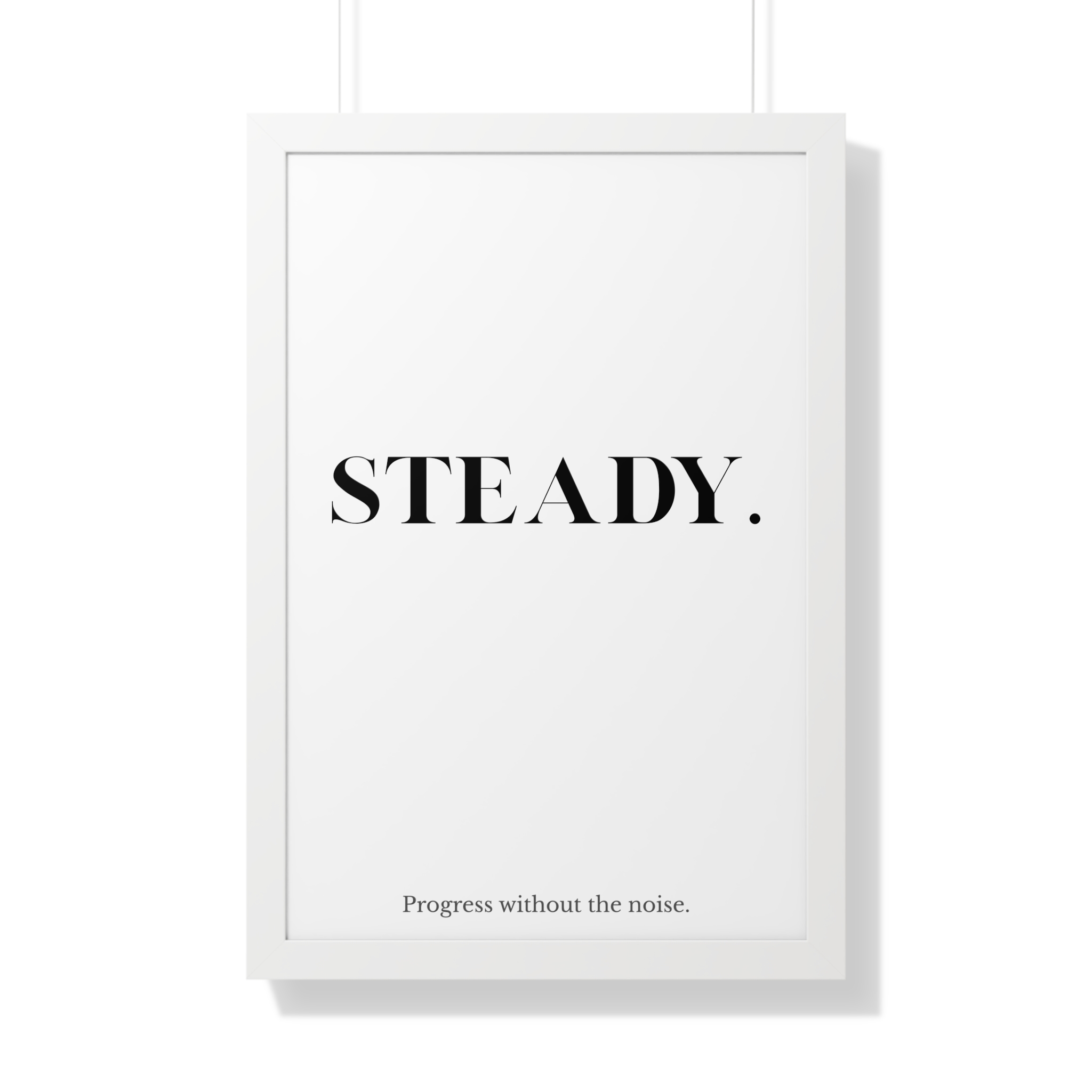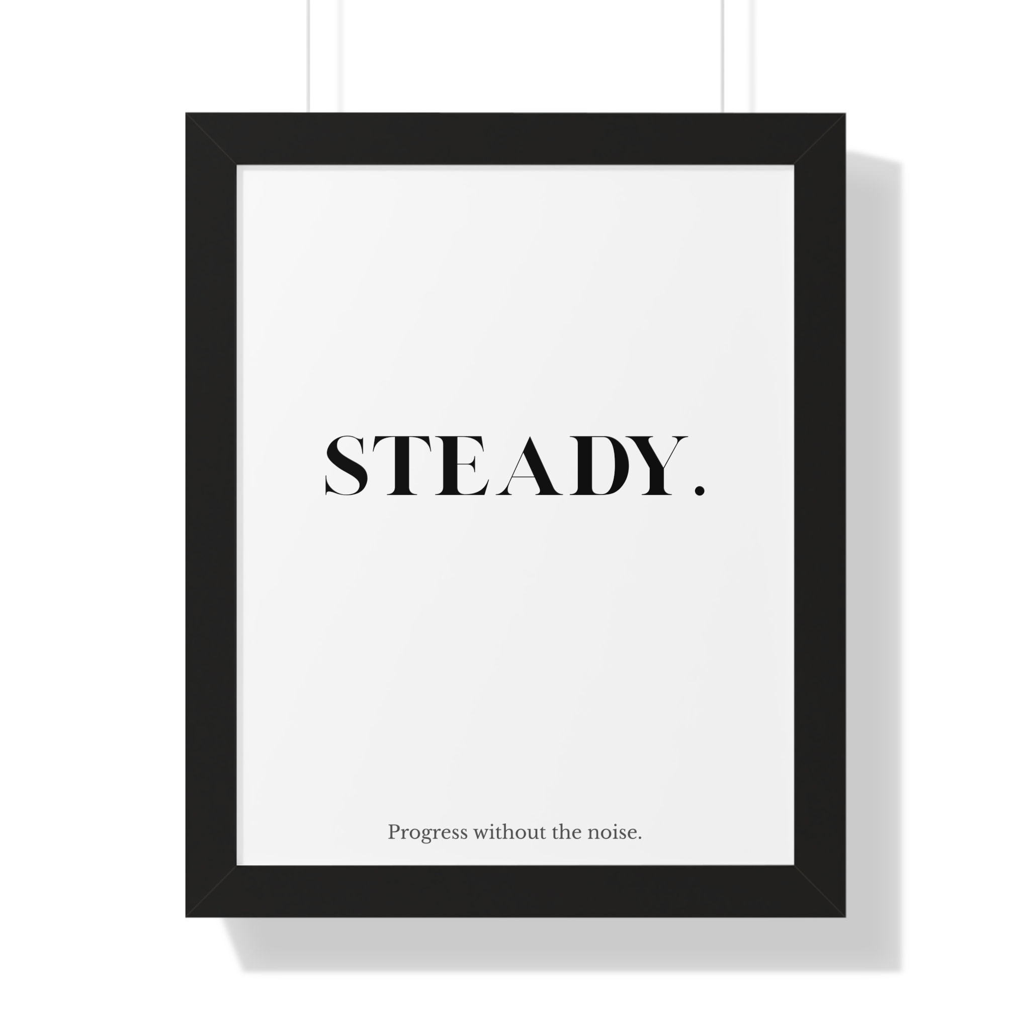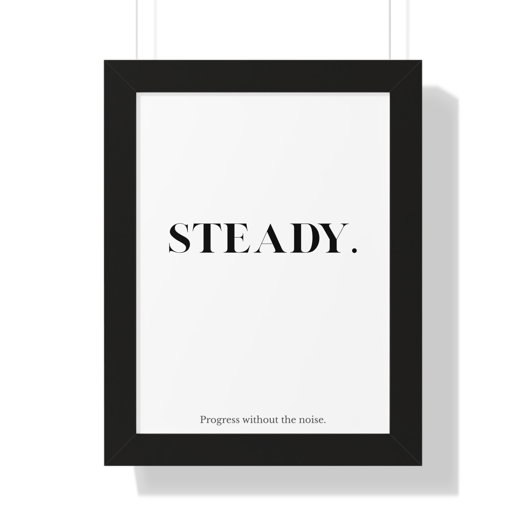 The STEADY. framed poster is a minimalist affirmation piece designed to support patience, resilience, and quiet progress. Featuring bold serif typography paired with the reassuring line “Progress without the noise,” this artwork encourages movement without pressure.